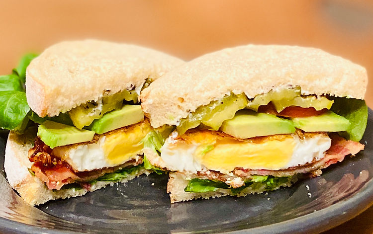 Stek bacon och ägg. Rosta bröd. Skiva tomat, rödlök och avokado. Dela några sallatsblad. Bred majonäs eller gräddfil på brödet. Lägg på påläggen och även smörgåsgurka eller saltgurka. Om mackan blir hög kan man sticka igenom grillpinnar för att hålla ihop den. Dela på mitten och hugg in!