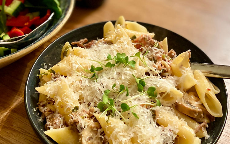 4. Servera med nykokt pasta och riven parmesanost.