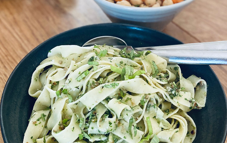 Vänd ner peston i den nykokta pappardellen och servera med kikärts- och morotssalladen.