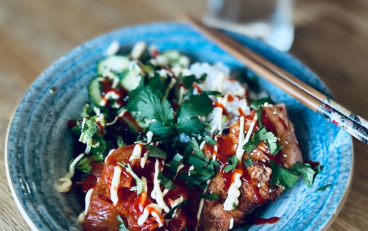 Servera laxen med ris, gurksallad och broccoli. Ringla srirachasås och majonäs över. Kimchi och färsk koriander till är ett måste!